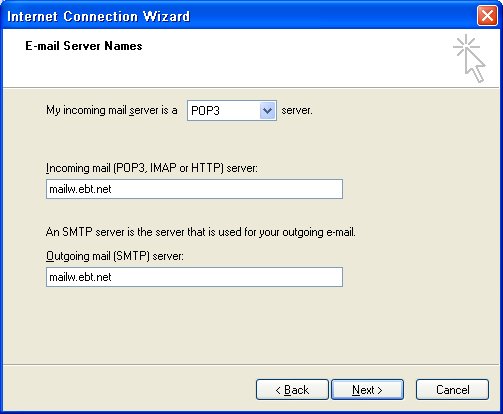 | 7. | Type in both the incoming mail server and outgoing mail server: mailw.ebt.net once you have typed both in click next. |